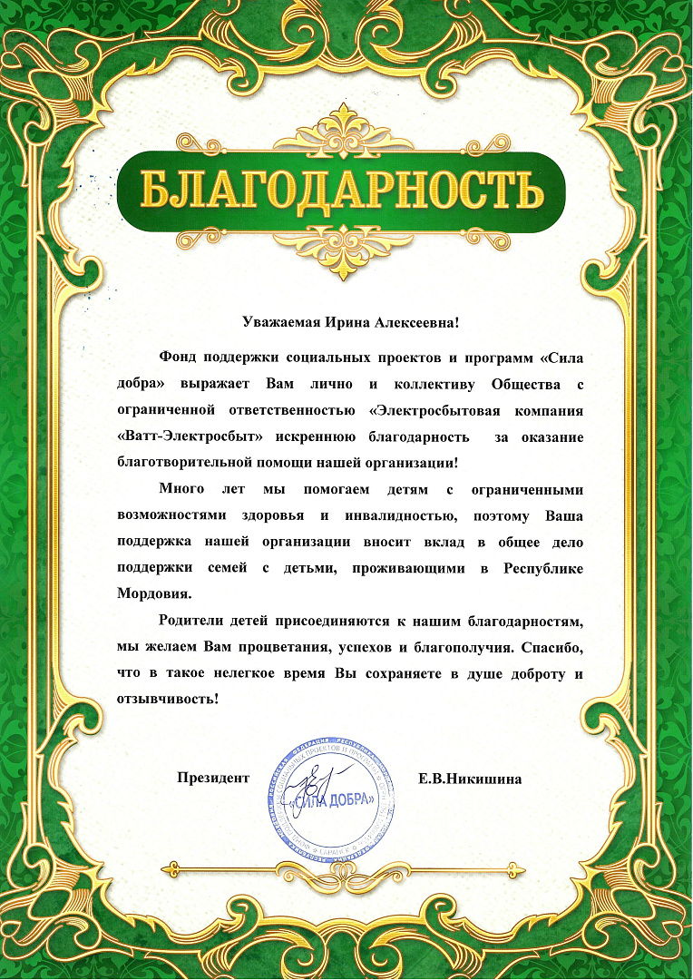 «26 марта 2026 года ООО «Ватт-Электросбыт» в качестве почетного гостя приняло участие в торжественном мероприятии, посвященном 10-летию оказания реабилитационной помощи Фондом «Сила Добра». За 20 лет работы Фонда и 10 лет оказания профессиональной помощи детям было реализовано 15 направлений реабилитации, выполнено 13 грантовых проектов при поддержке Фонда президентских грантов и Правительства Республики Мордовия.